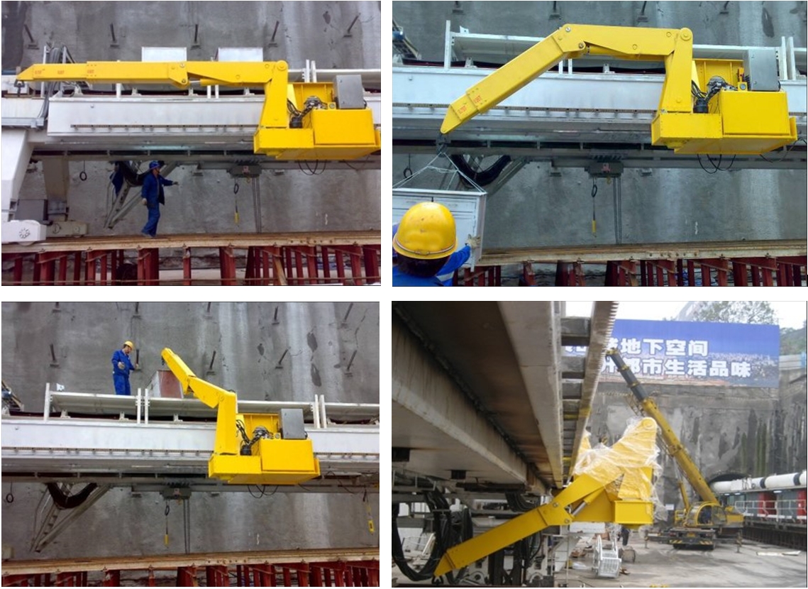 折臂吊是在TBM的有限空間范圍內(nèi),根據(jù)對物料的起吊、搬運、轉(zhuǎn)移和就位的功能要求而設(shè)計的專用成套設(shè)備,它包含液壓泵站和控制系統(tǒng)。遙控操作。